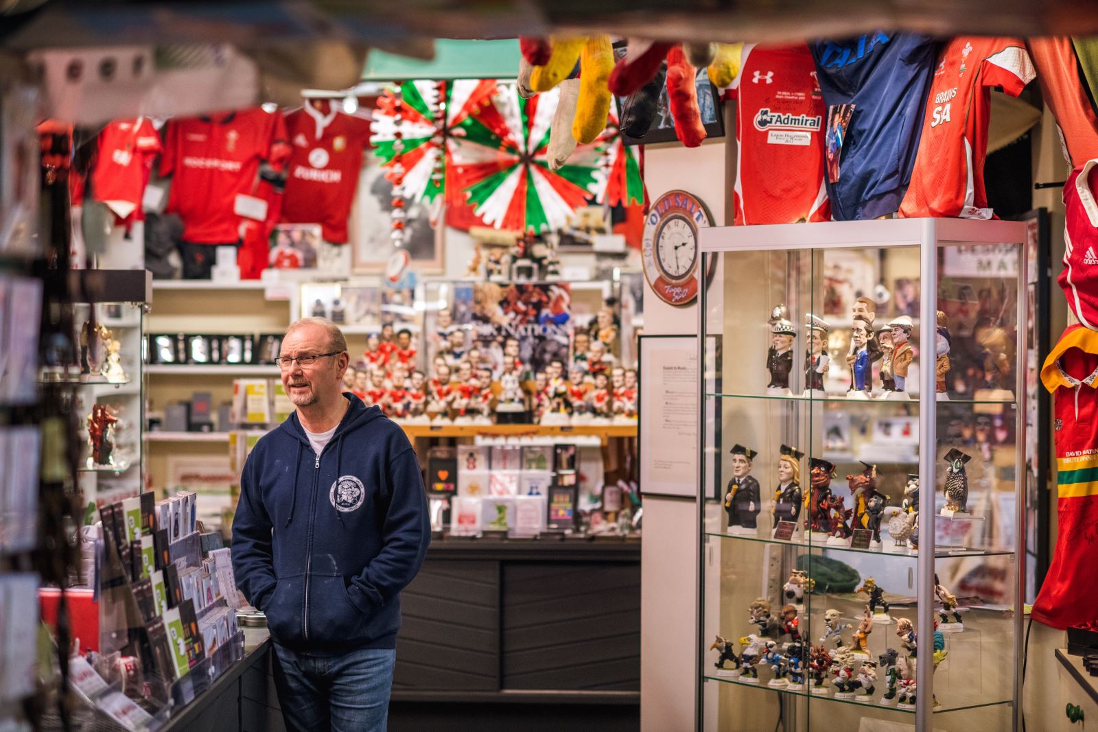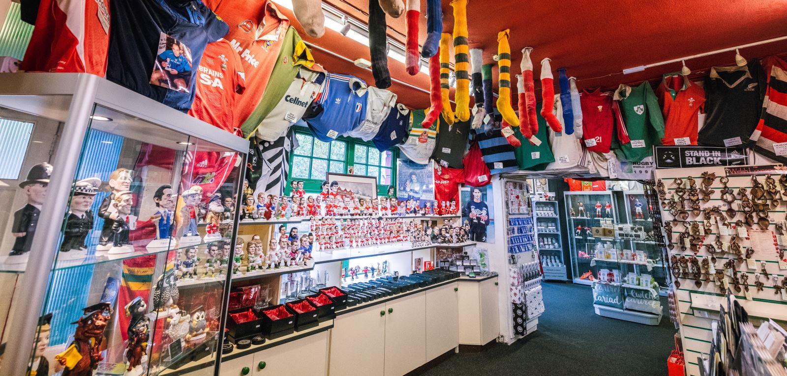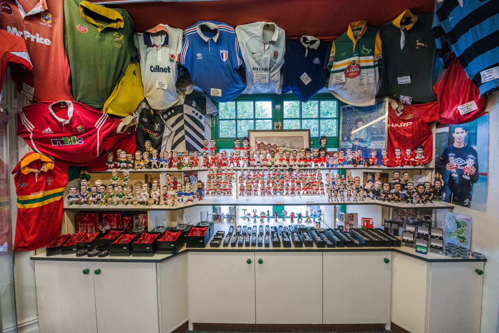 Inside, the rooms have changed use many times – some of the walls have come and gone and then come back again. The former garage is now the Groggshop museum, but for most of its life was our moulding room, with shelves full of moulds bearing the names of the world’s greatest rugby stars. The famous ‘Wall of Fame’ signature wall – now in my studio – was once in the firing room, which for many years housed two giant kilns. Simon’s packing room, in a former life, was the ladies powder room. The original main bar was Dad’s first studio, but over the years the shop space has grown to encompass the whole of the front of the building, its ceilings entirely covered with shirts (and shorts and socks) generously donated to us by international players from the past 50 years.